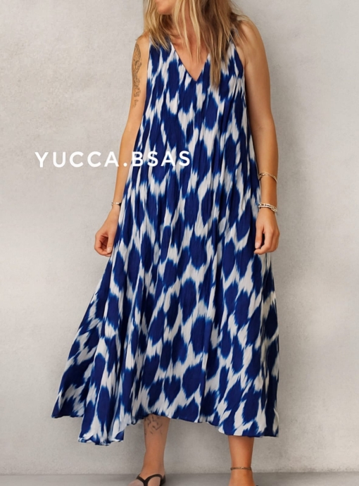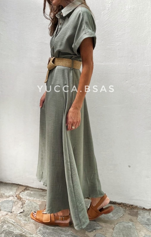 Vestido midi de algodón rústico con recortes y volados, escote en «V» con tiras. Tiene mangas globo 3/4 con elástico y bolsillos.