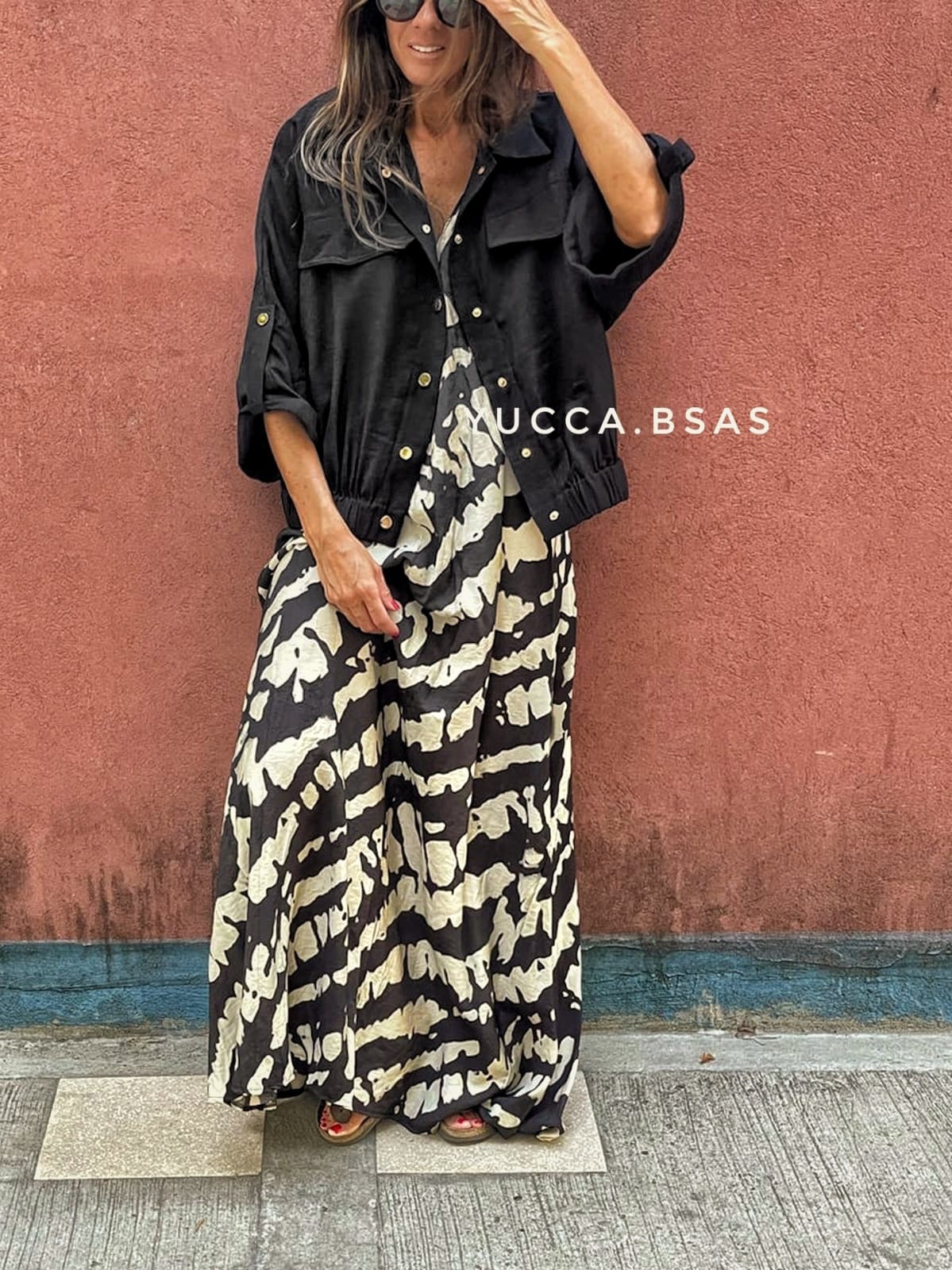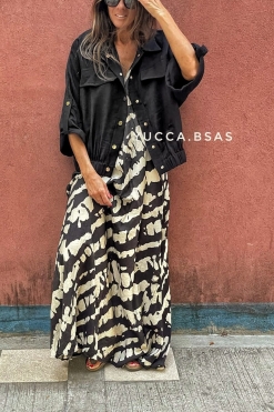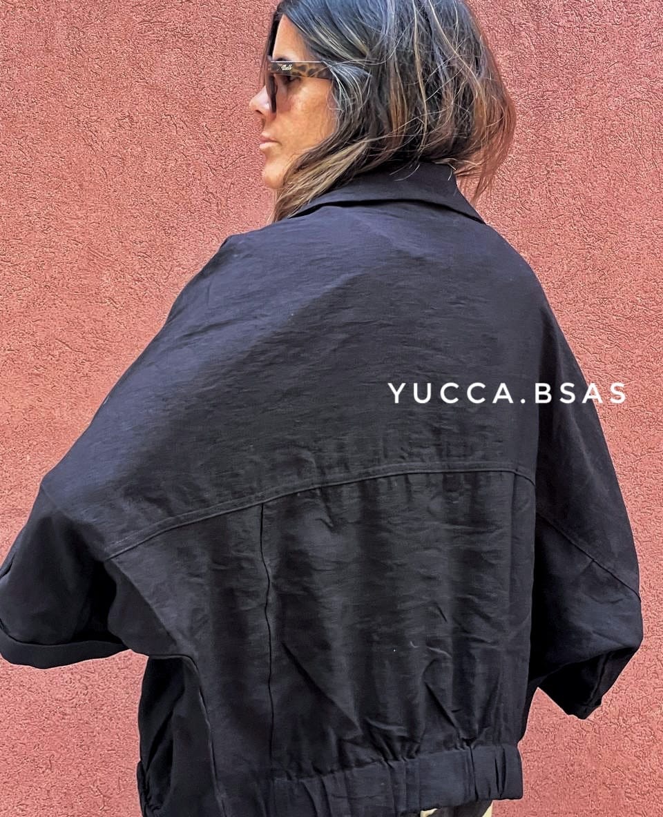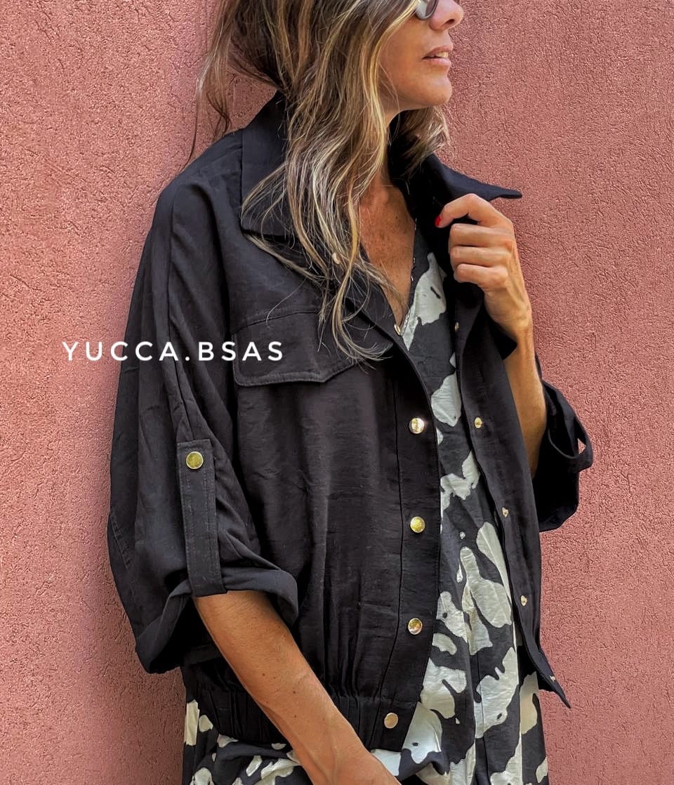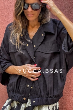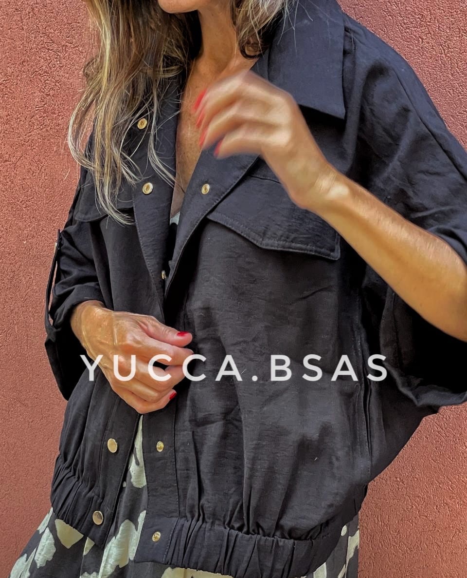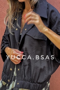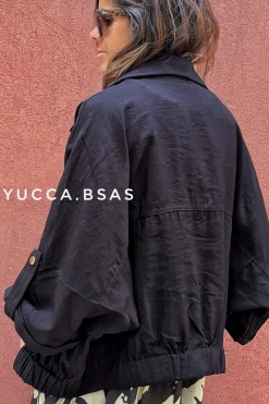 Camisaco tipo bomber de lino con cintura elastizada, mangas 3/4 caídas anchas. Tiene presillas con broches metálicos dorados y bolsillos.