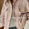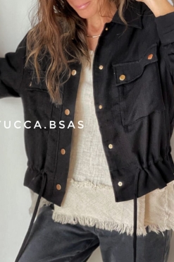 Camisaco tipo bomber de lino con cintura elastizada, mangas 3/4 caídas anchas. Tiene presillas con broches metálicos dorados y bolsillos.