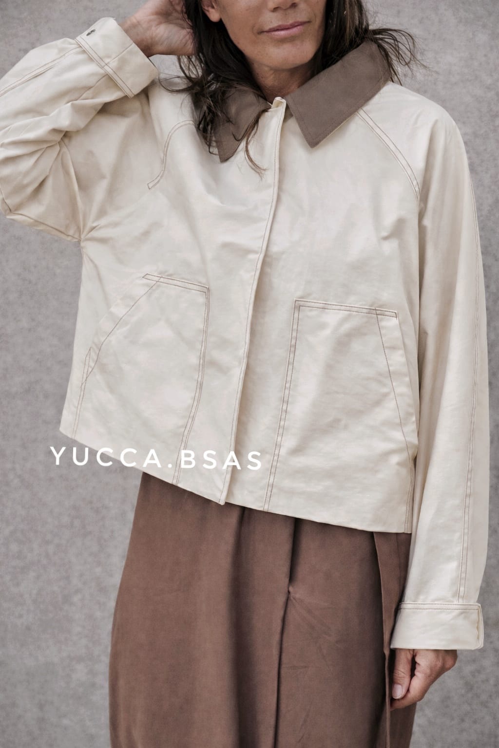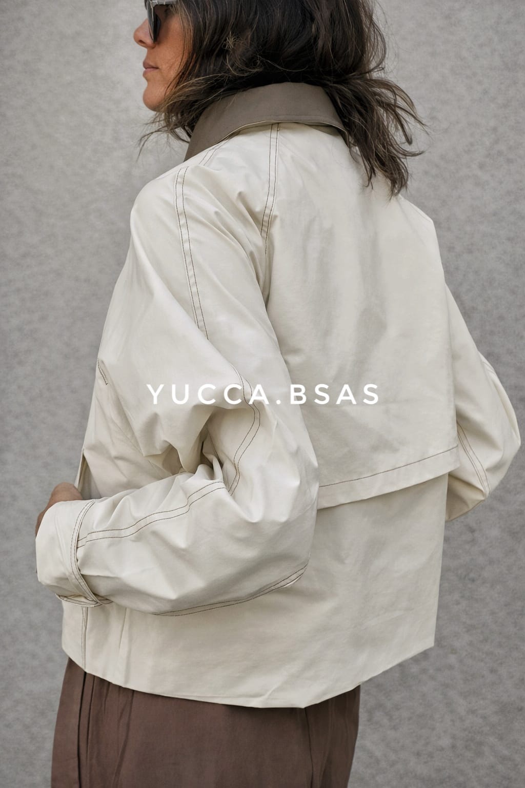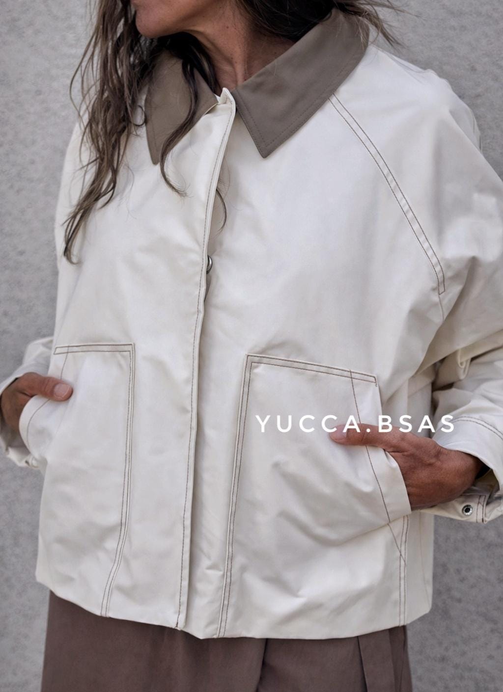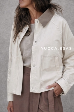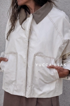 Campera corta tipo Trench impermeable con cuello camisero en contraste, cierre frontal oculto y bolsillos amplios delanteros que aportan practicidad. Las costuras visibles le dan un detalle moderno y cuidado, mientras que el canesú en la espalda suma un toque clásico inspirado en los trench tradicionales. La campera está totalmente forrada.