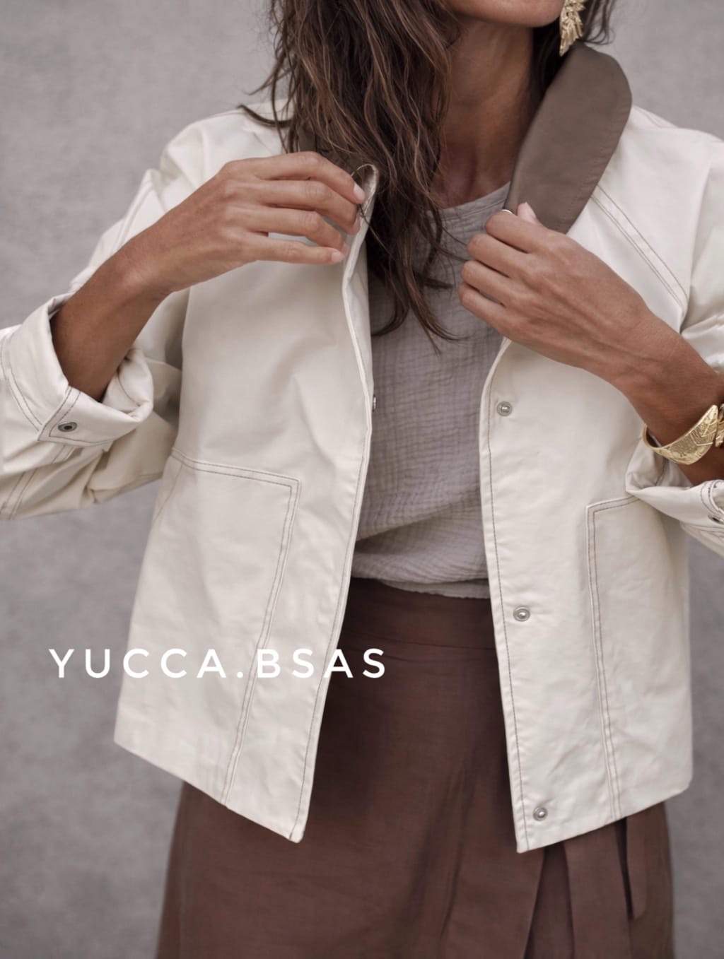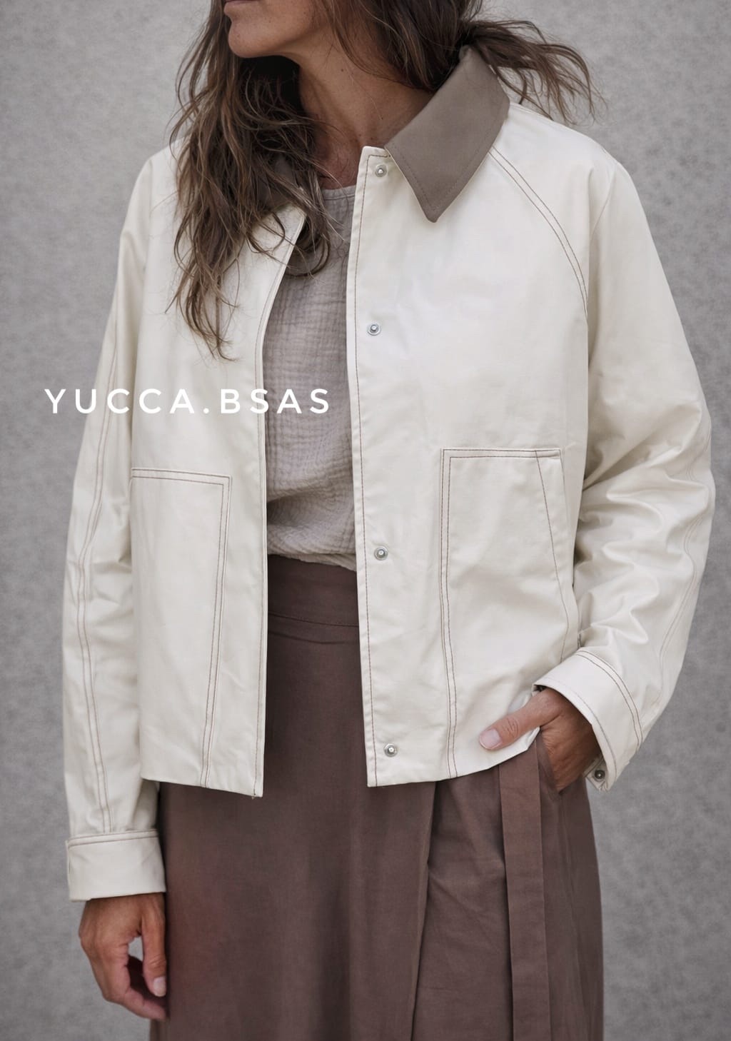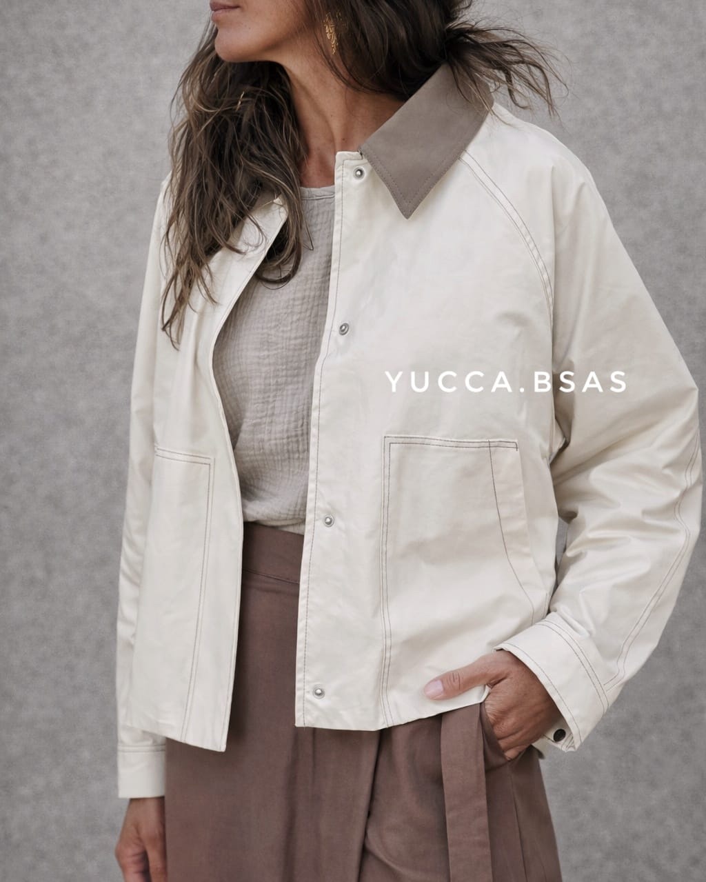 Campera corta tipo Trench impermeable con cuello camisero en contraste, cierre frontal oculto y bolsillos amplios delanteros que aportan practicidad. Las costuras visibles le dan un detalle moderno y cuidado, mientras que el canesú en la espalda suma un toque clásico inspirado en los trench tradicionales. La campera está totalmente forrada.