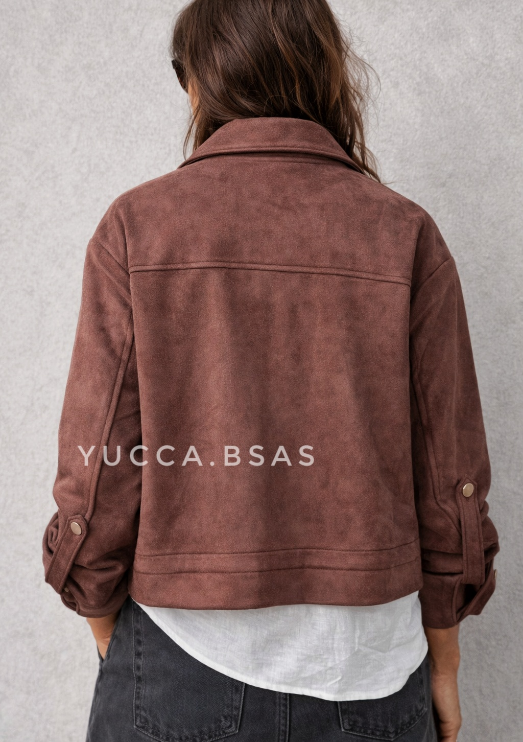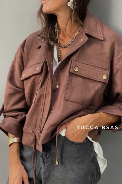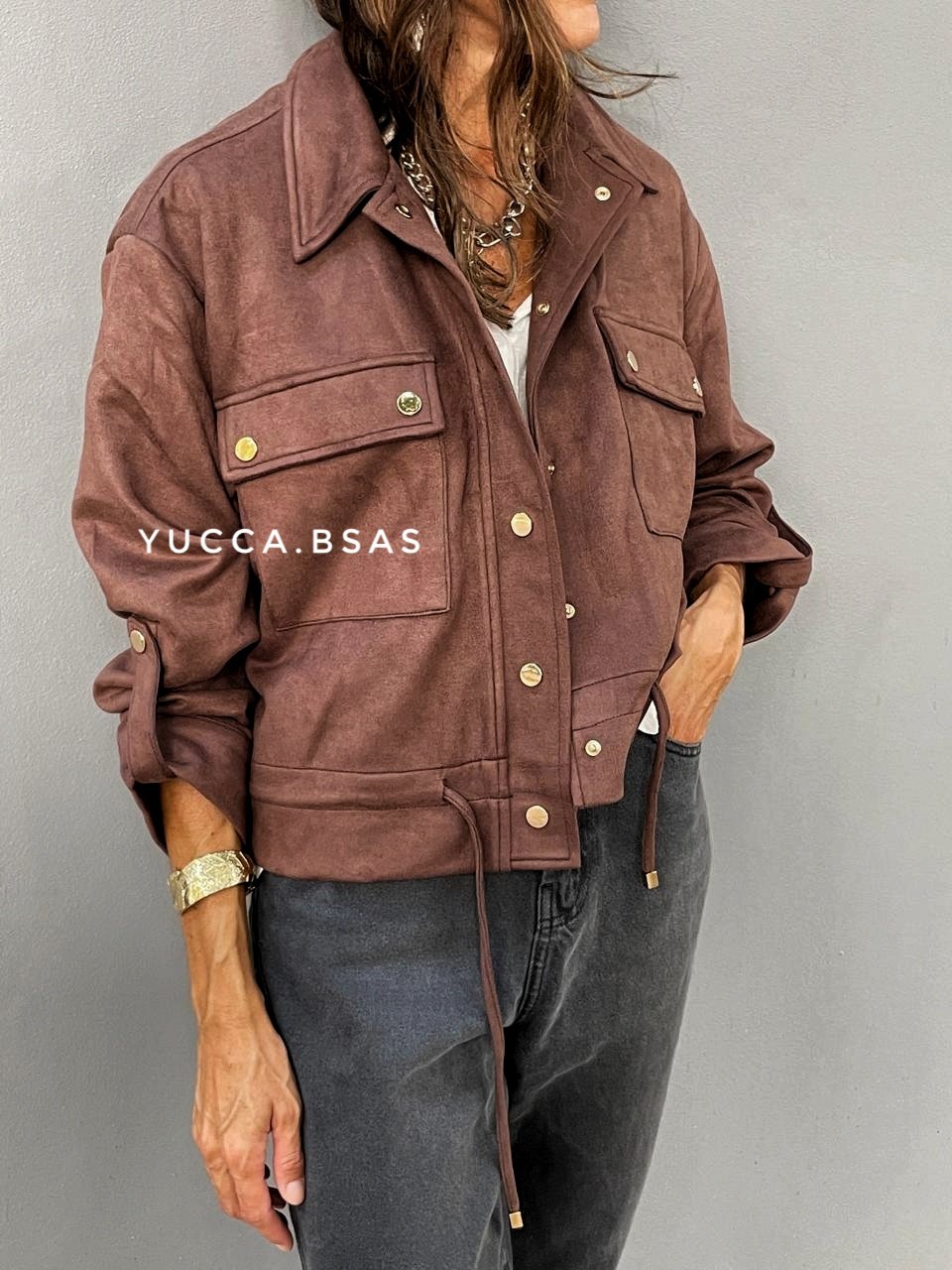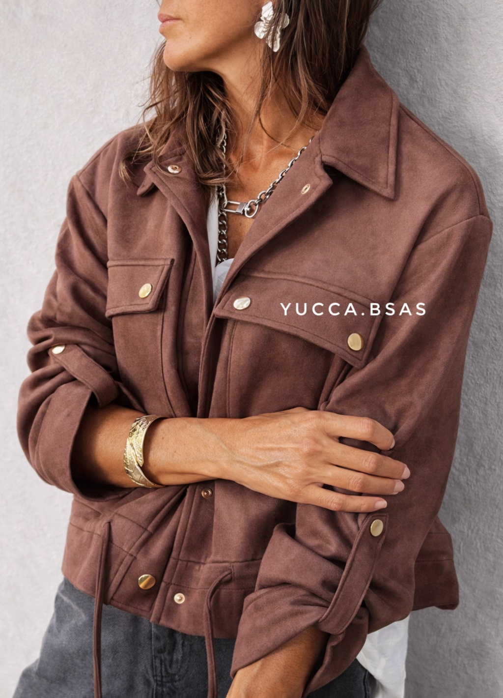 Campera tipo chaqueta gamuzada con botones metálicos dorados, bolsillos en la pechera, mangas largas con presillas y detalle de lazo en la cintura.
