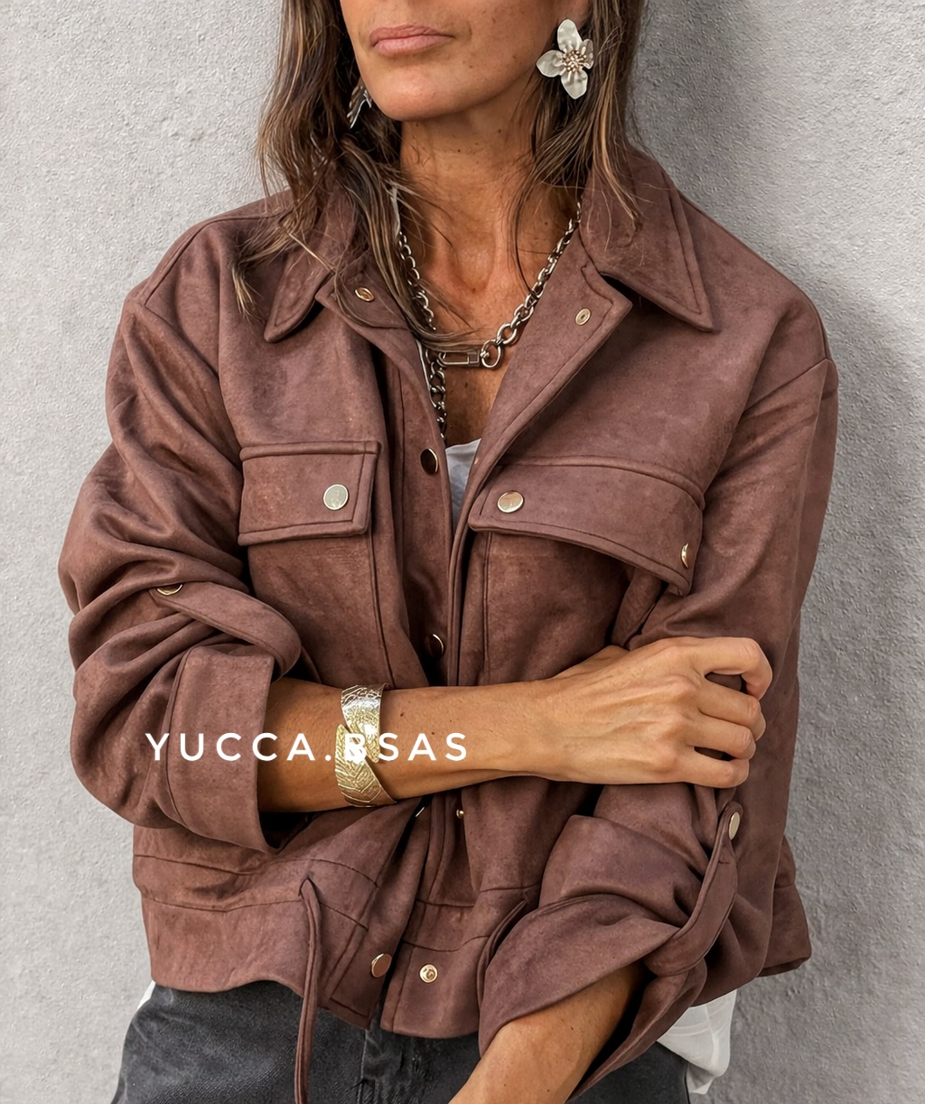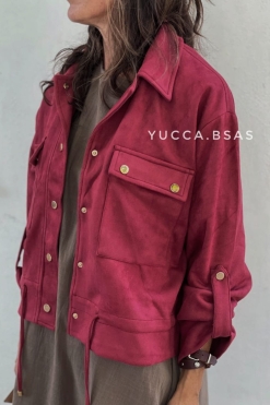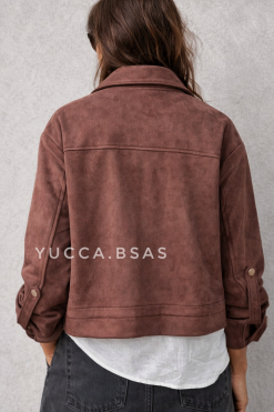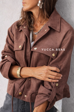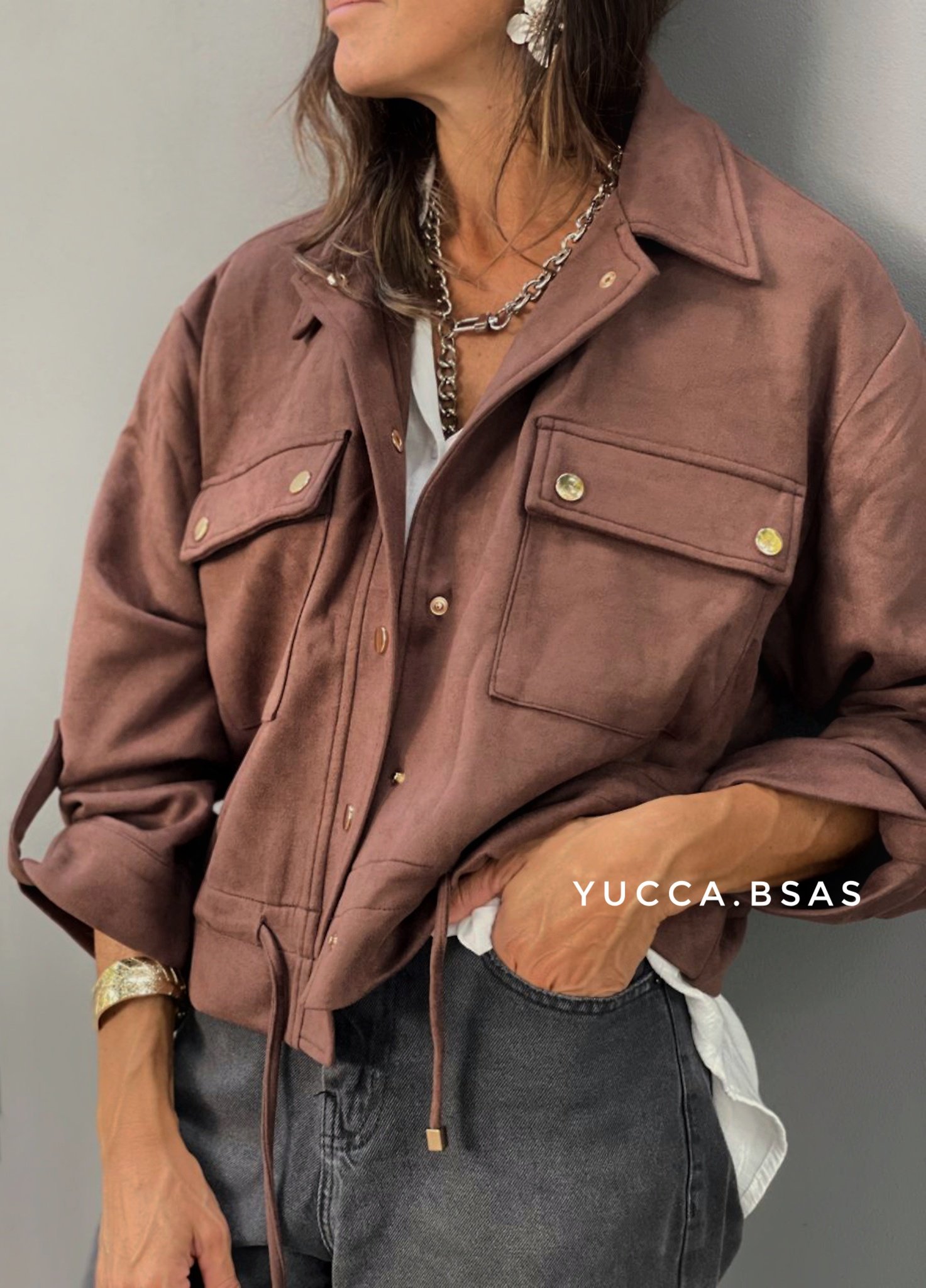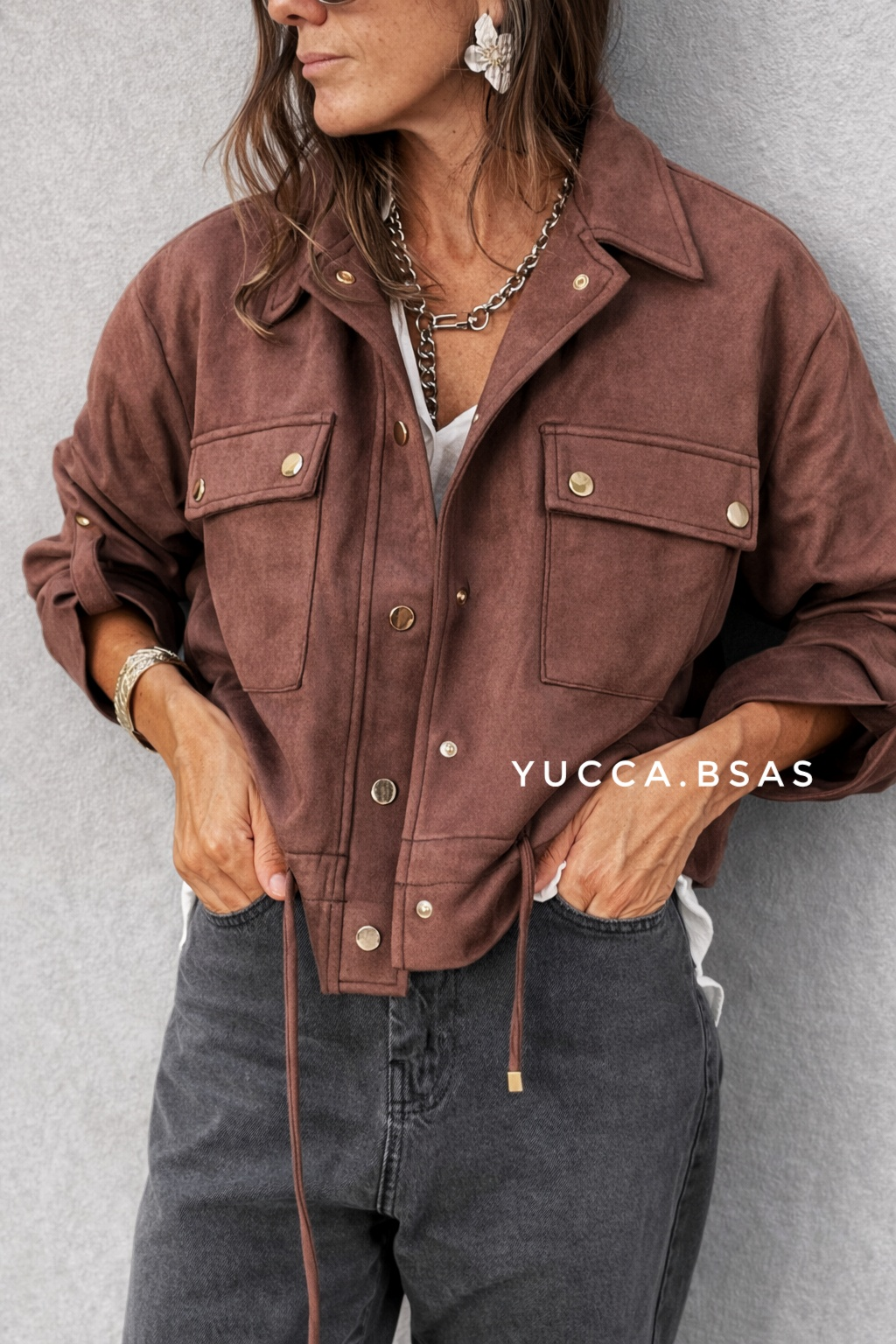 Campera tipo chaqueta gamuzada con botones metálicos dorados, bolsillos en la pechera, mangas largas con presillas y detalle de lazo en la cintura.