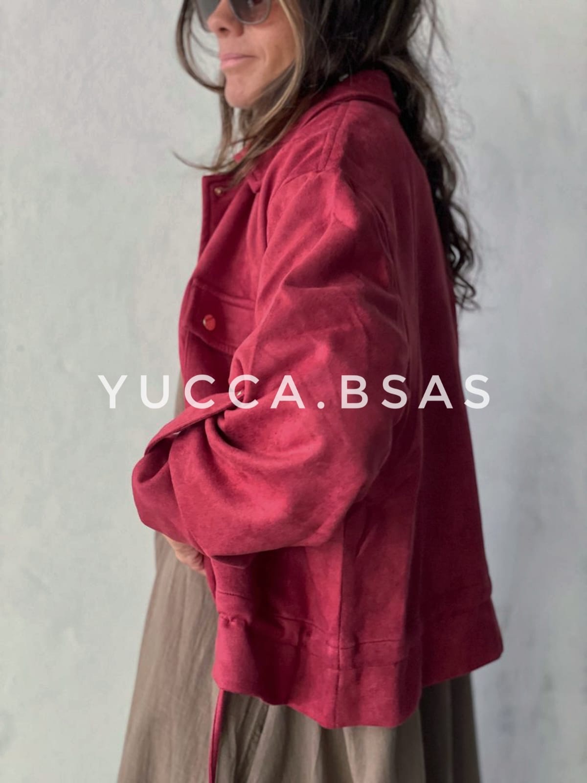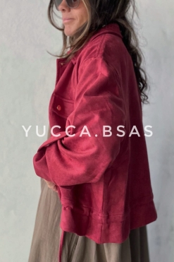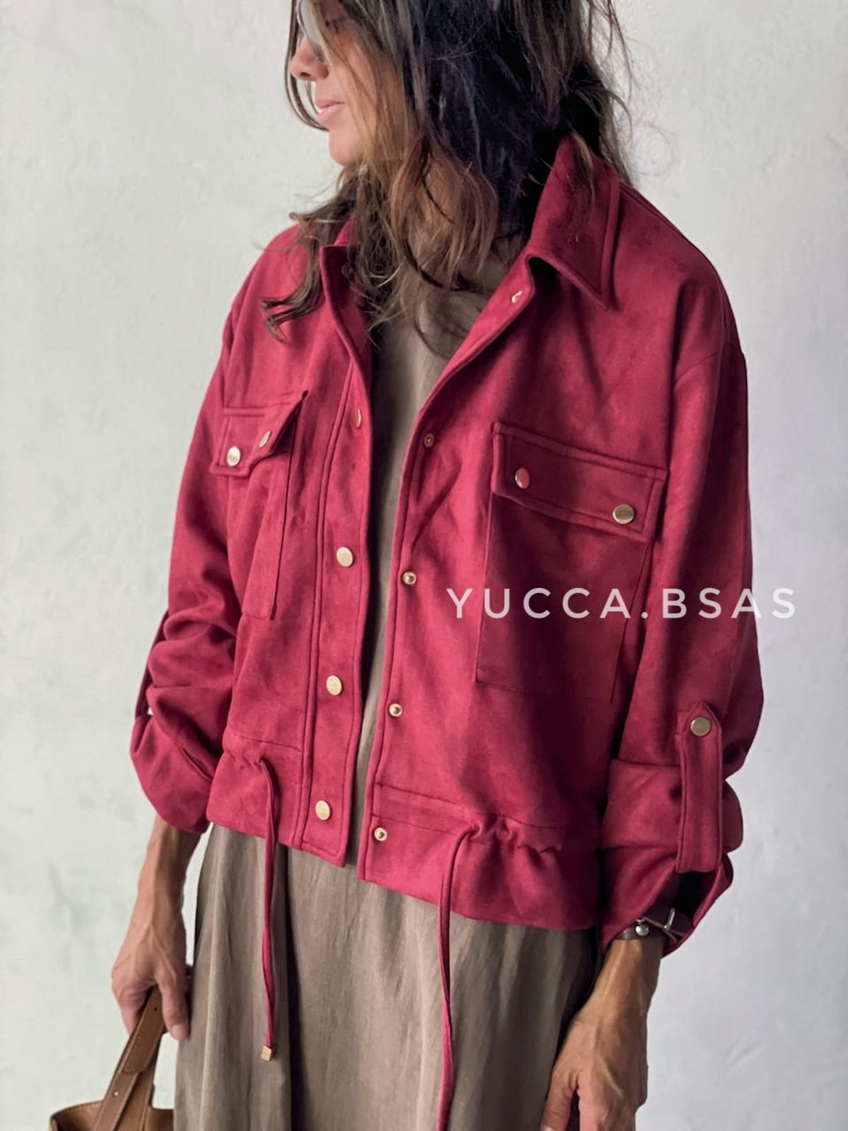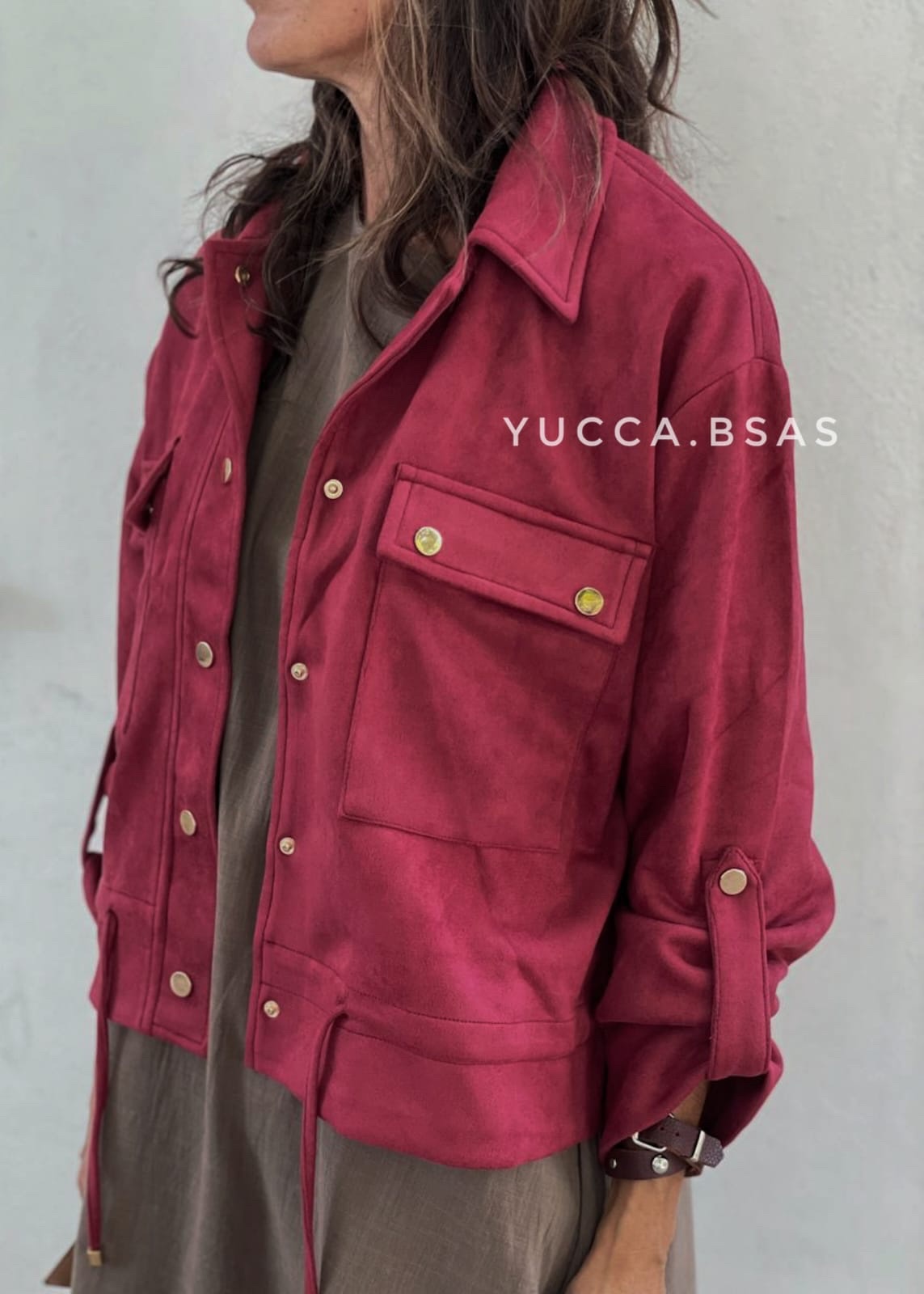 Campera tipo chaqueta gamuzada con botones metálicos dorados, bolsillos en la pechera, mangas largas con presillas y detalle de lazo en la cintura.