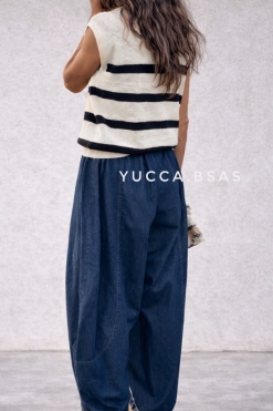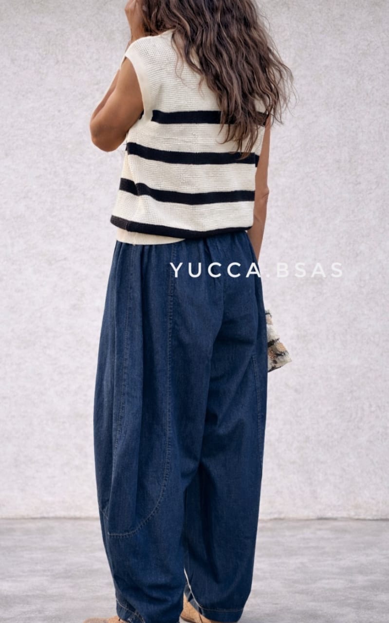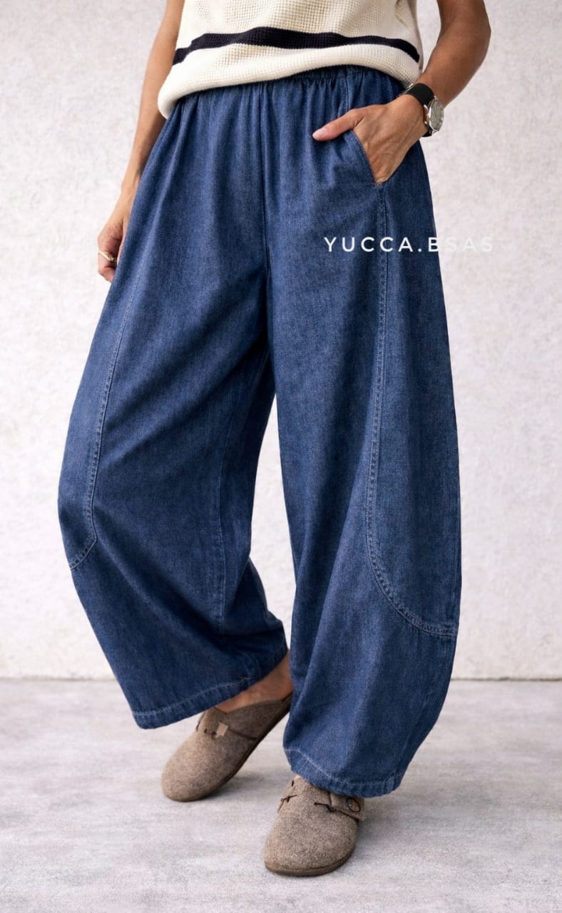 Pantalón de jean liviano con silueta balloon, de calce amplio y relajado. Tiro alto con cintura elastizada que se adapta cómodamente al cuerpo. Piernas voluminosas con leve entalle en botamanga que generan ese efecto abombado característico. Cuenta con bolsillos delanteros y costuras curvas que estilizan la forma.