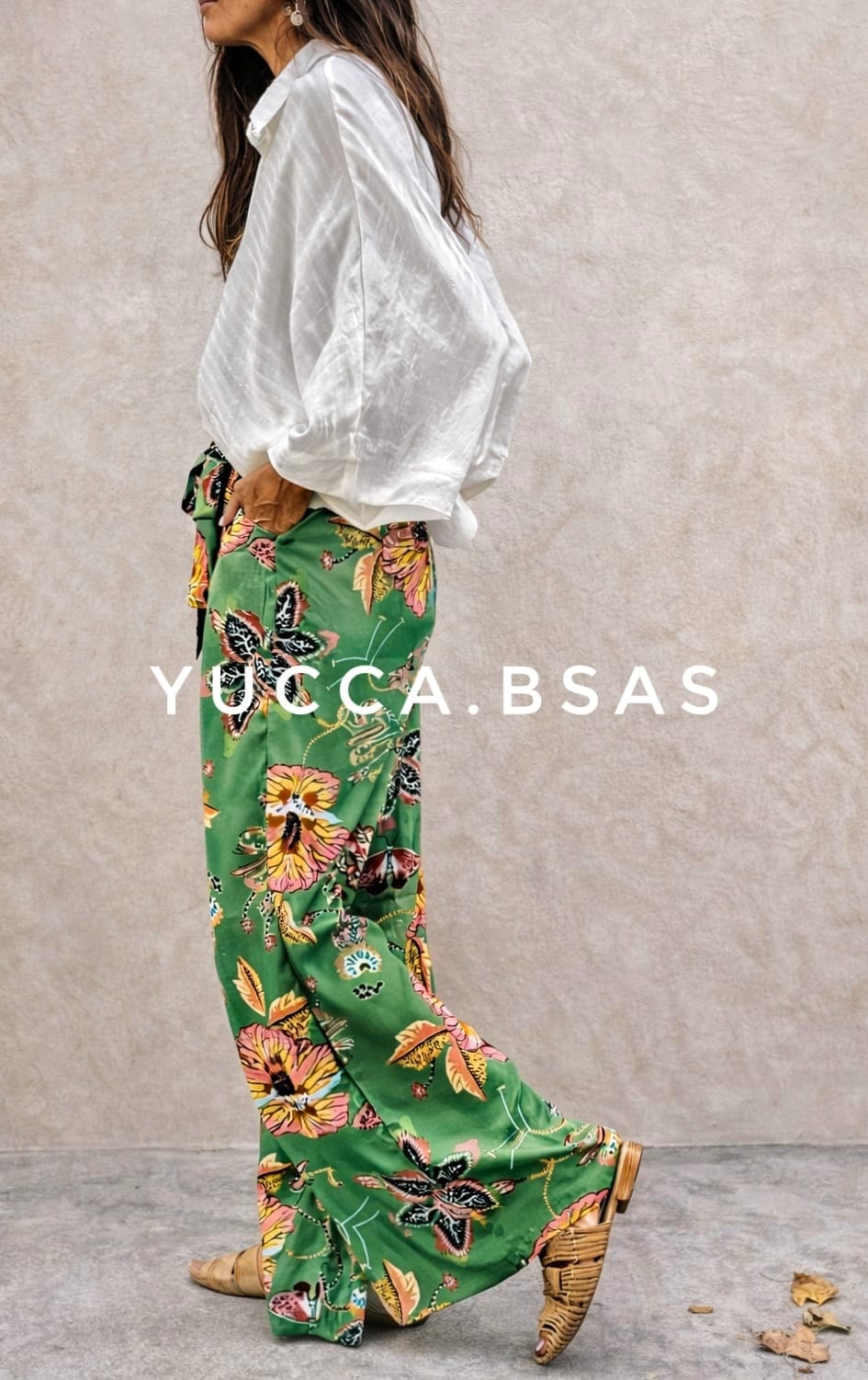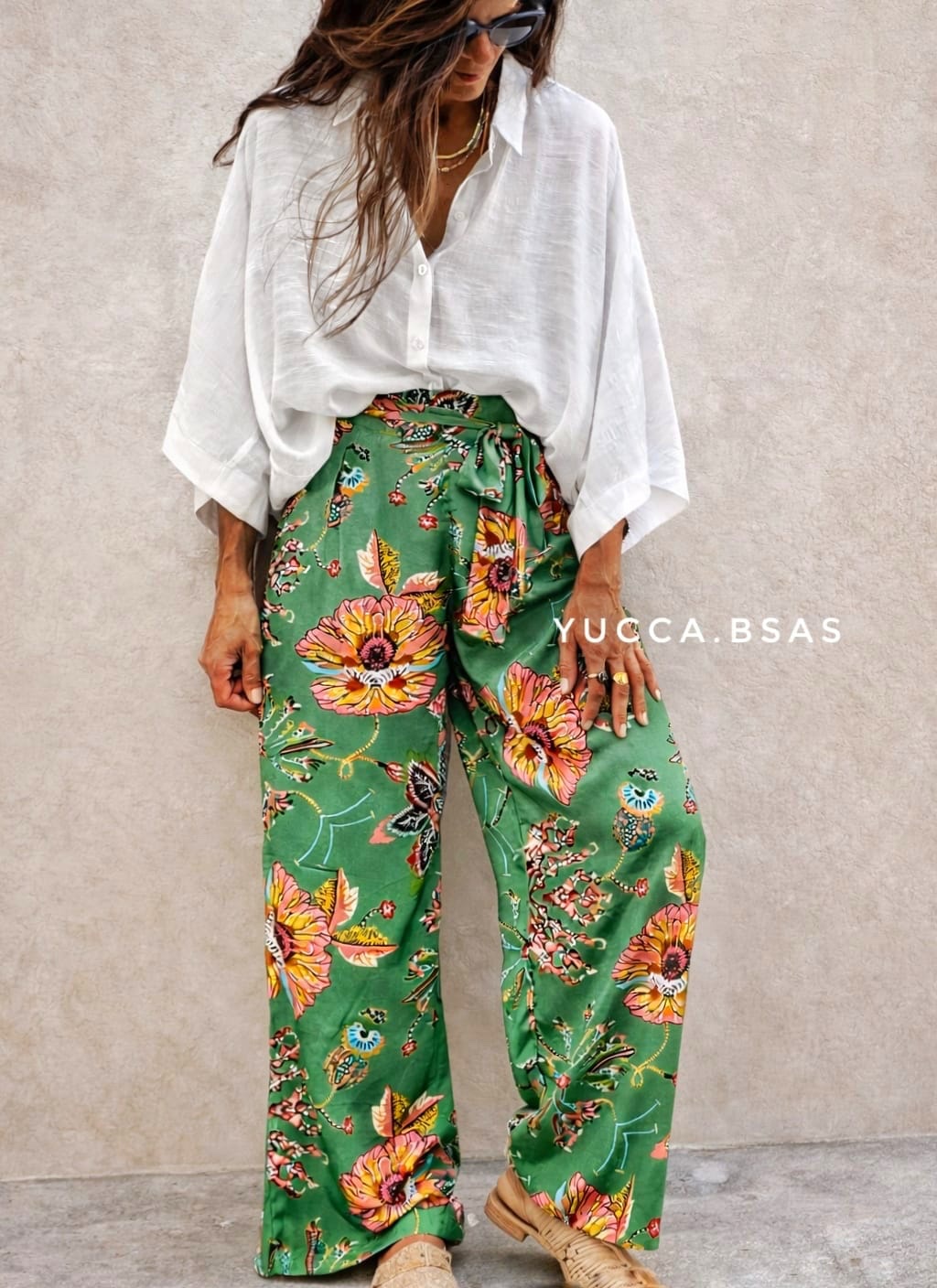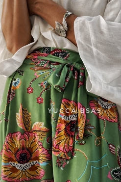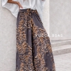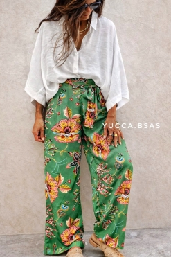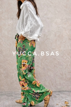 Pantalón ancho de seda estampada con pinza en la delantera y cintura elastizada en la parte de la espalda. Tiene un lazo para adaptarlo y bolsillos a los costados.