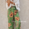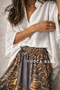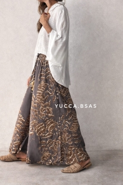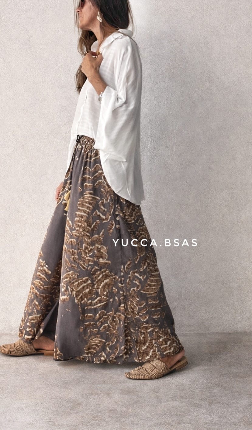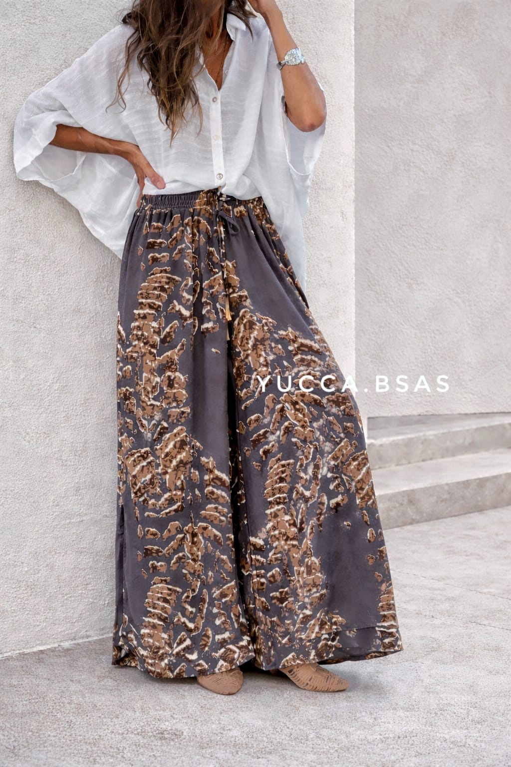 Pantalón de seda súper ancho y amplio con estampa abstracta y detalle en dorado. Tiene tiro alto con cintura elastizada con lazo y borlas doradas.
