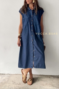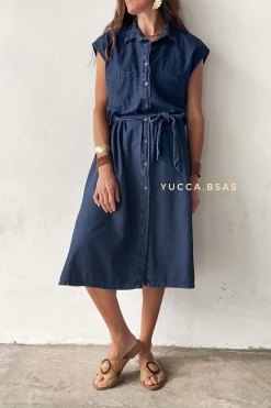 Vestido midi camisero de tela denim azul con mangas japonesas tiene presilla con lazo en la cintura y tajos a los laterales.