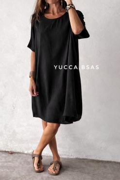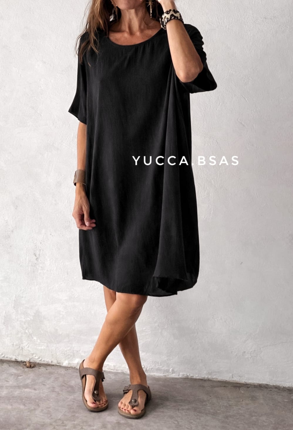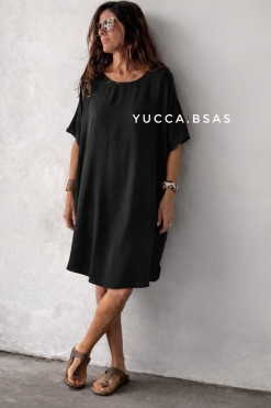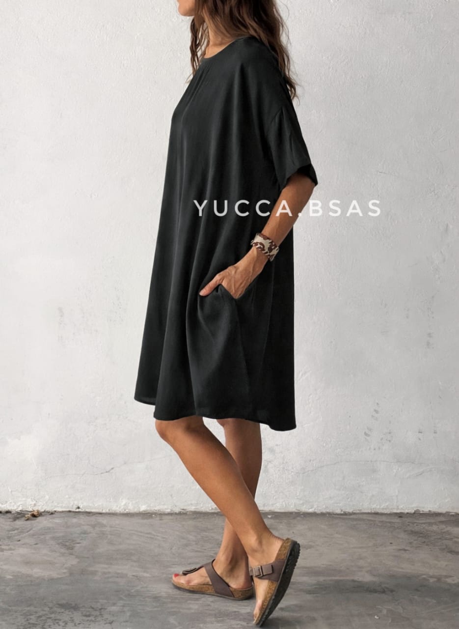 Vestido corto / remeron oversize sedificado con cuello redondo, hombros caídos, mangas cortas y bolsillos. El largo es en forma curva.