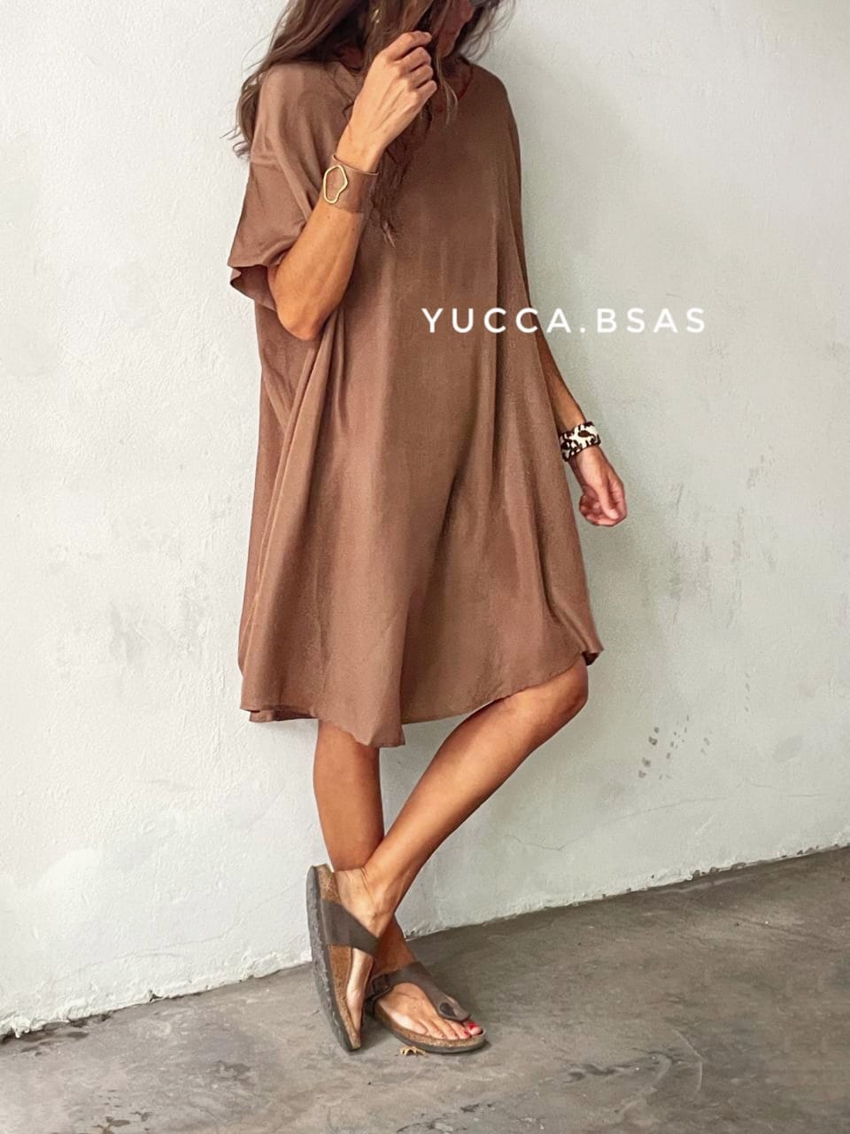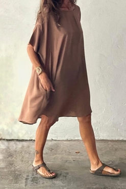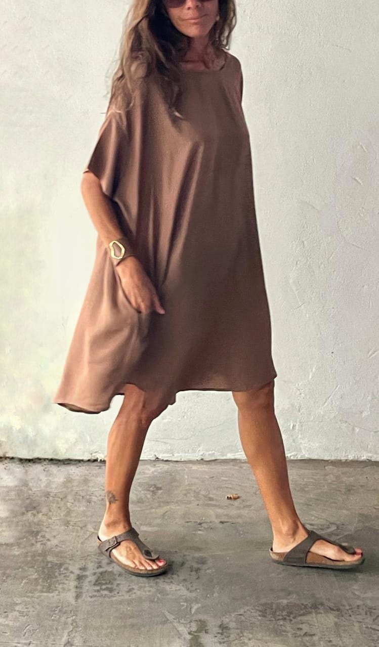 Vestido corto / remeron oversize sedificado con cuello redondo, hombros caídos, mangas cortas y bolsillos. El largo es en forma curva.