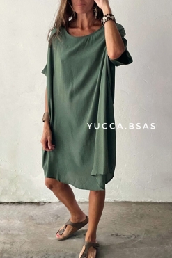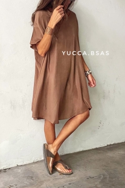 Vestido camisero de tela gamuzada, tiene cuello a la base, mangas ranglan con pinzas que hacen que sea un poco abollonada y los puños son anchos con un botón tipo gemelos. Los botones están ocultos y tiene bolsillos. Puede usarse tanto como vestido como camisa larga abierta.