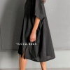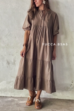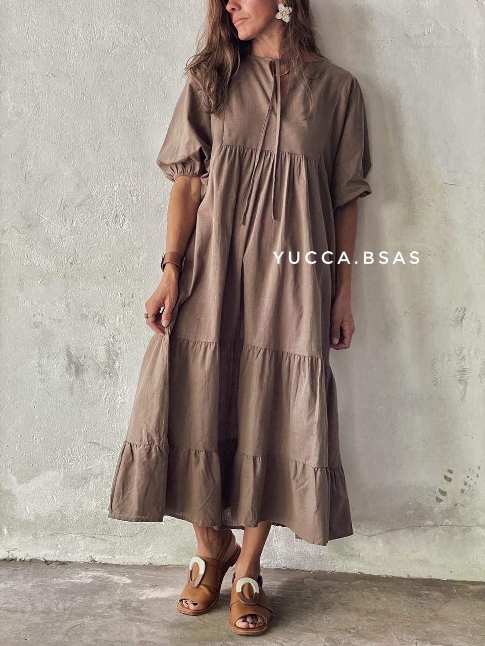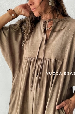 Vestido amplio midi de algodón rústico con recortes y volados, escote en «V» con tiras. Tiene mangas globo 3/4 con elástico y bolsillos.