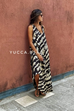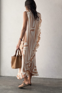 Vestido midi tipo seda con recortes y volados, escote en «V» con tiras. Tiene mangas globo 3/4 con elástico y bolsillos.