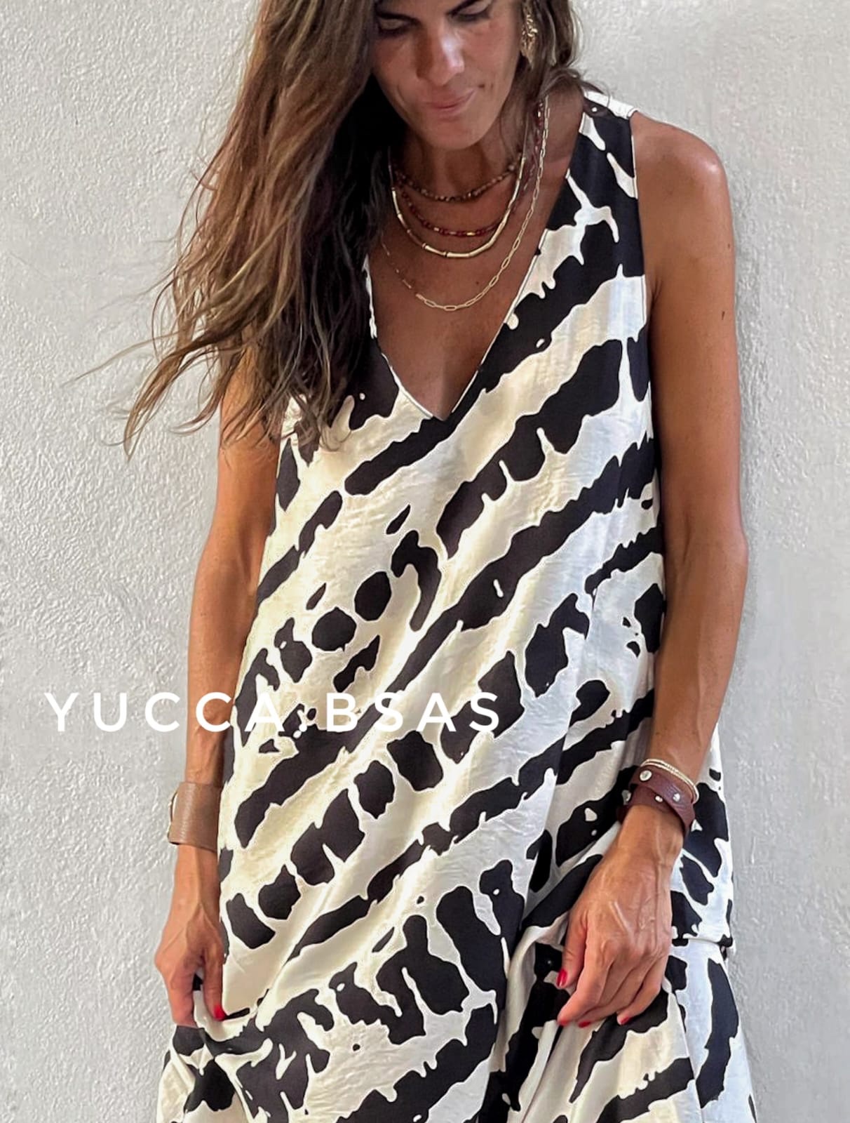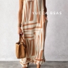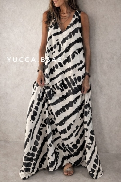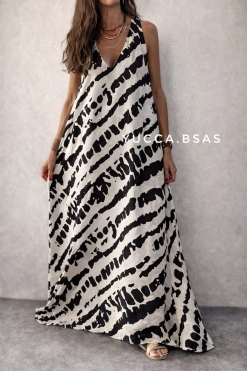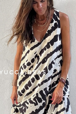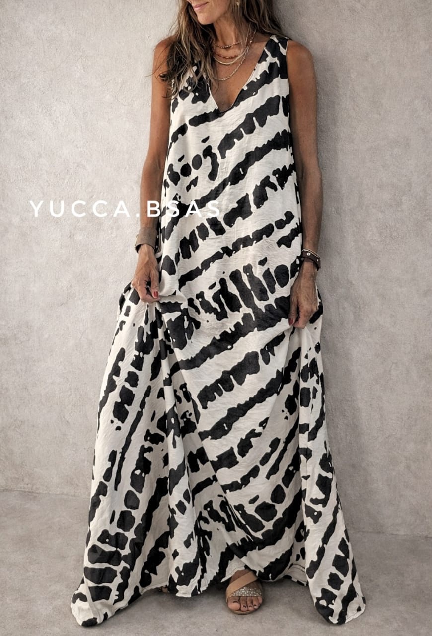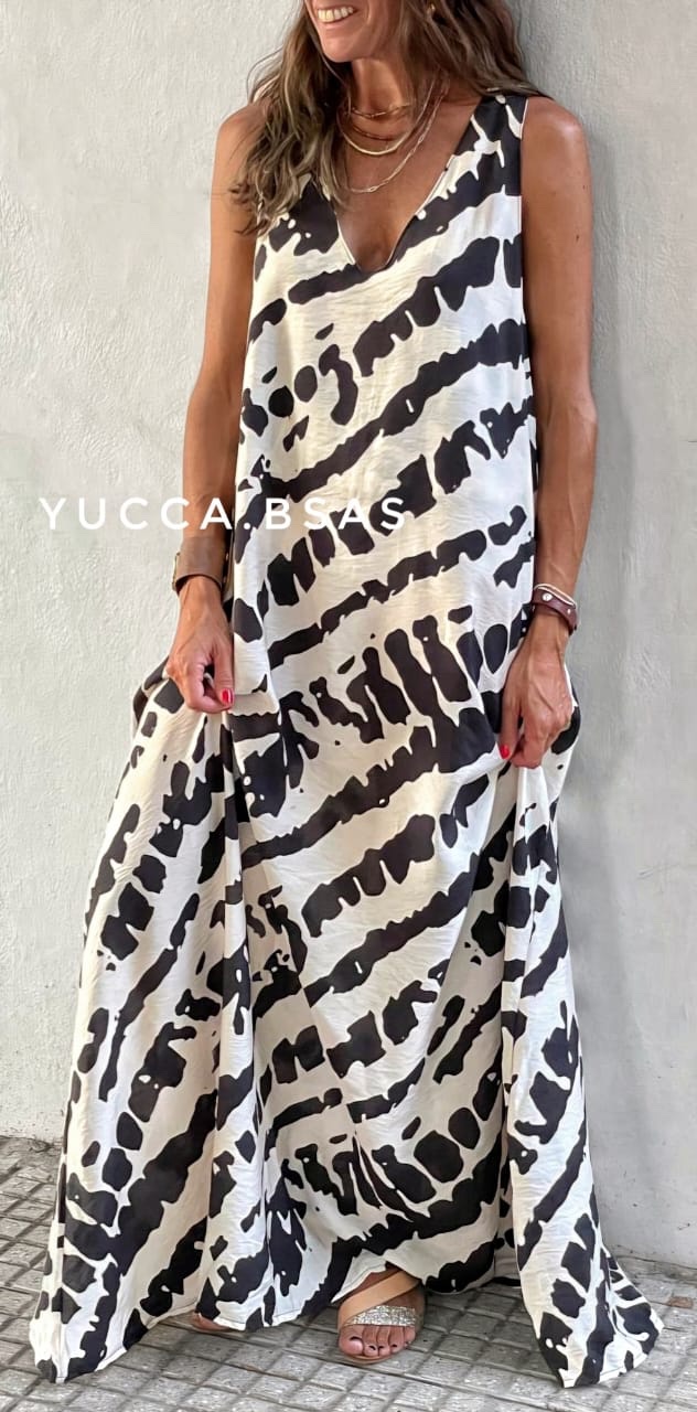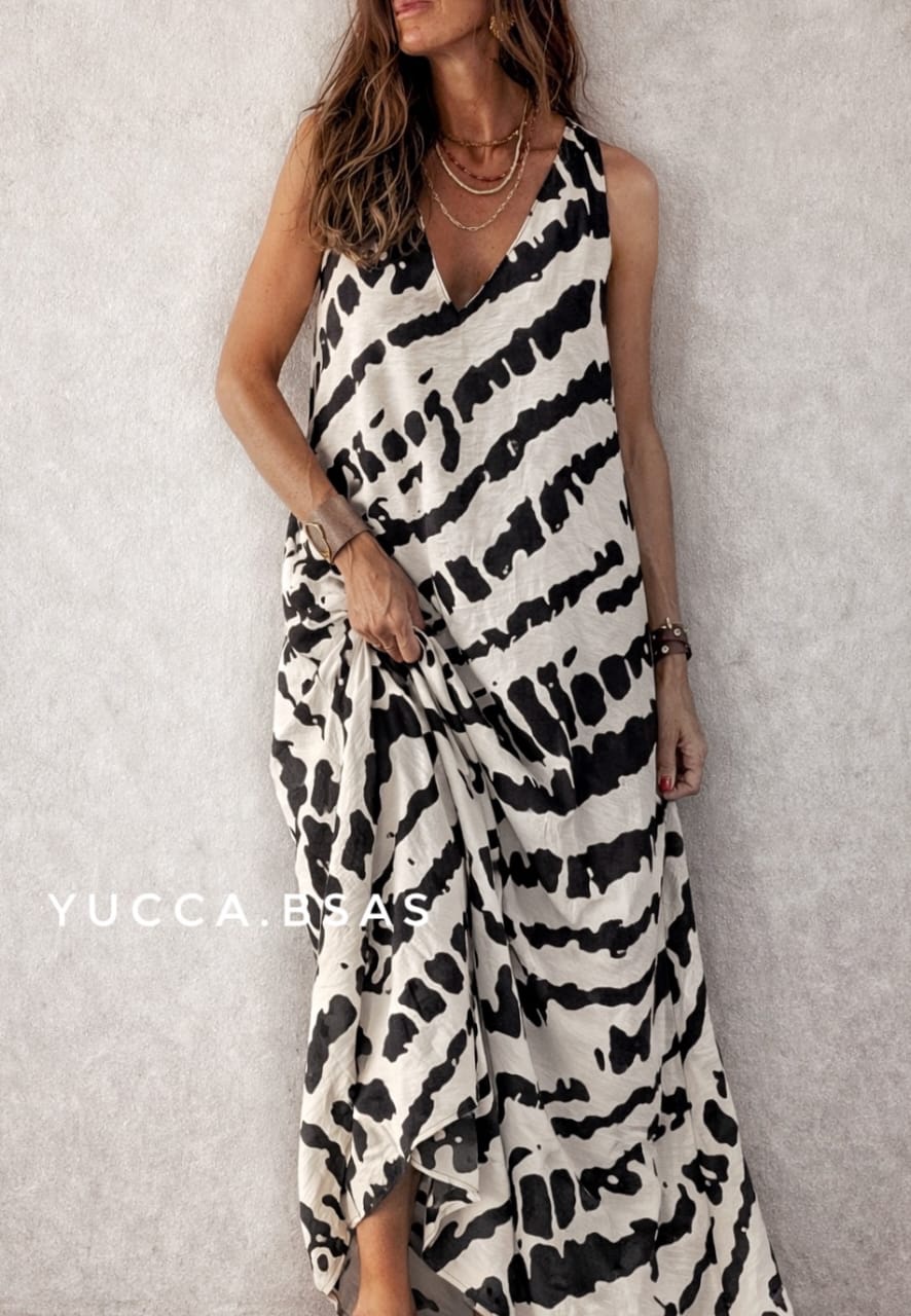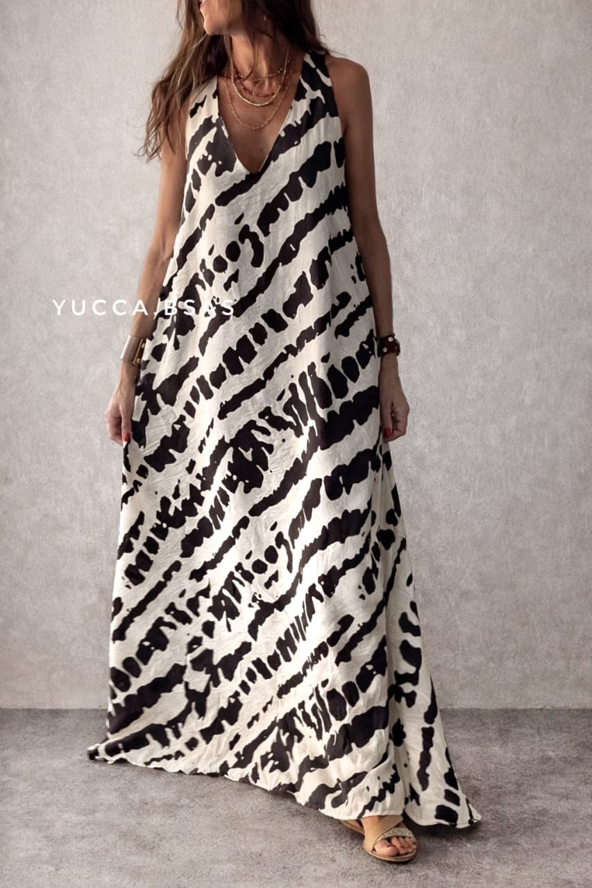 Vestido largo de viscosa con estampa abstracta en natural y negro. Escote en V sin mangas y de corte evasé.