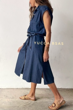 Vestido oversize camisero de jean celeste con manga tipo japonesa. Tiene bolsillos y tajos pequeños en los laterales.