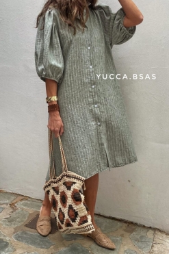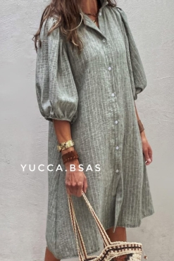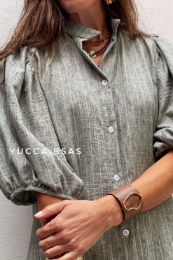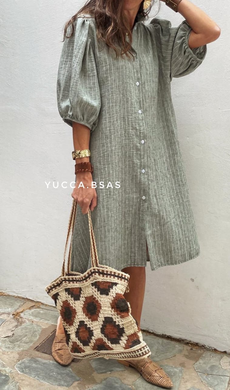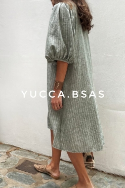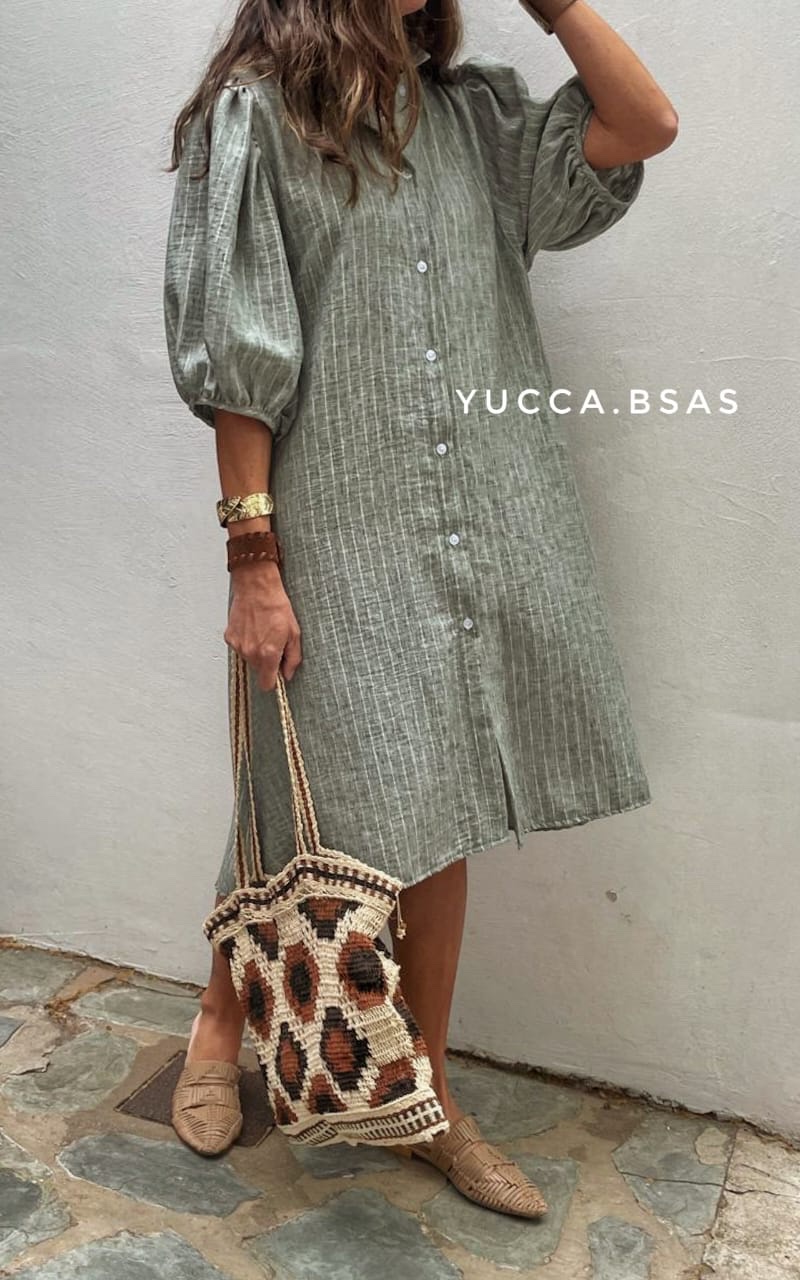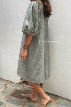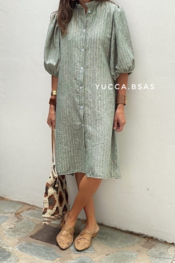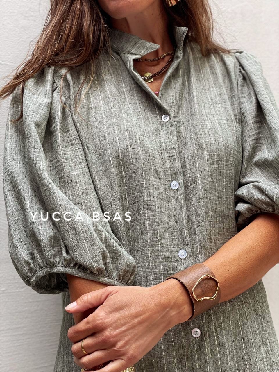 Vestido / Maxi camisa de lino liviano con finas raya. se puede usar como vestido amplio o como maxi camisa abierta. Su diseño oversize se realza con mangas princesa abullonadas con puño elástico, cuello mao y botonadura frontal.