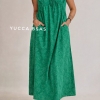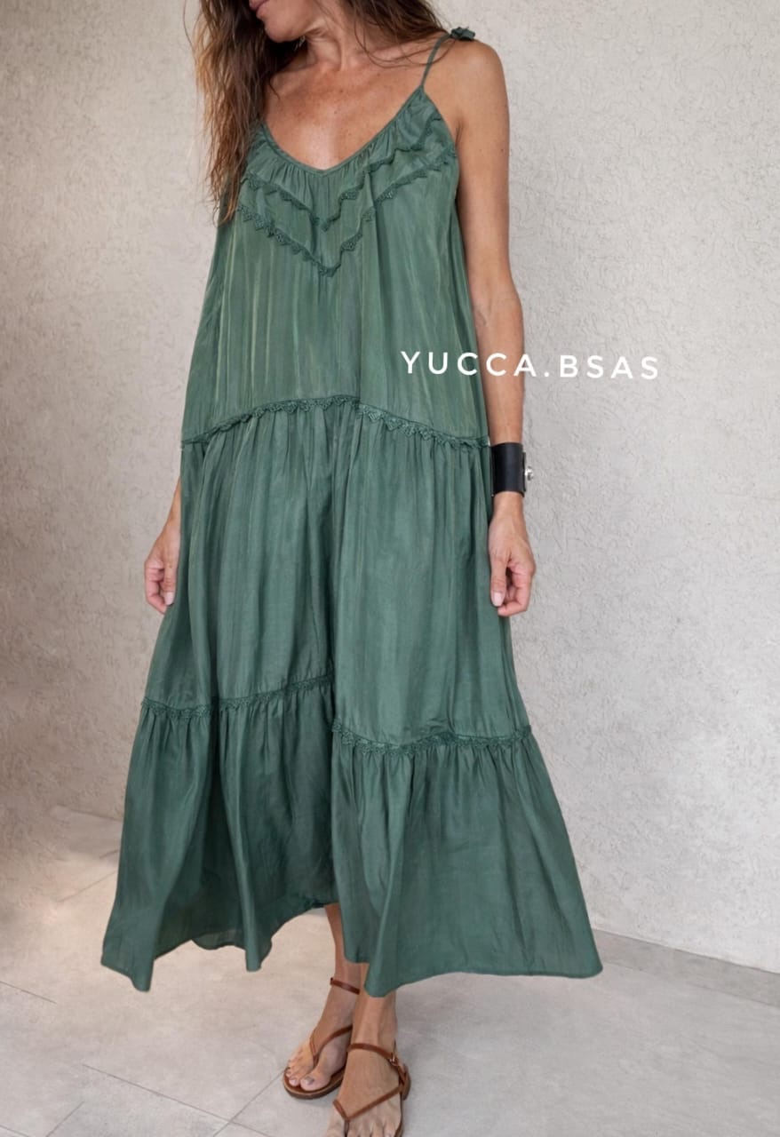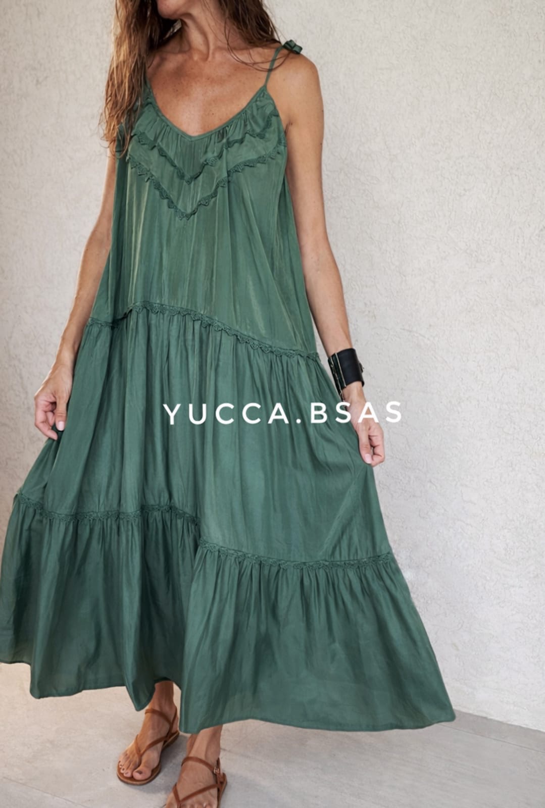 Vestido solero sedificado con tiritas regulables, tiene volados en la pechera con dos grandes volados en la falda y bolsillos.