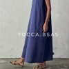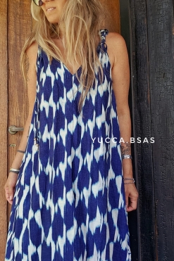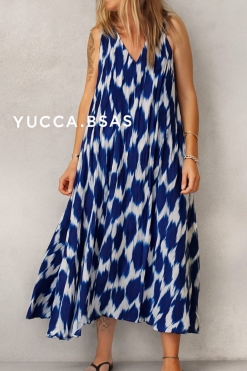 Vestido largo amplio estampado geométrico en tonos verde seco y tierra. Corte evasé, amplio y con caída natural. sin mangas con escote en V.