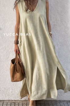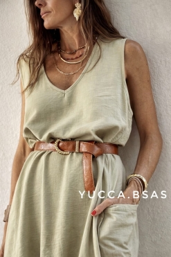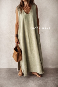 Vestido amplio largo confeccionado con una tela tipo crep rústica, liviana. Es un vestido sin mangas escote en V con bolsillos grandes a los costados y tajos laterales.