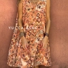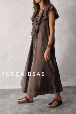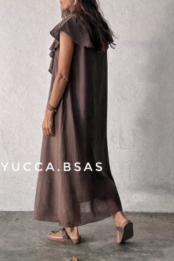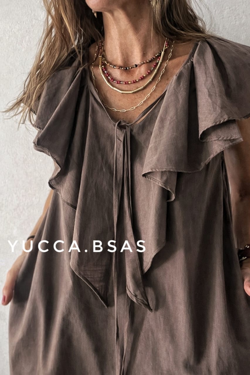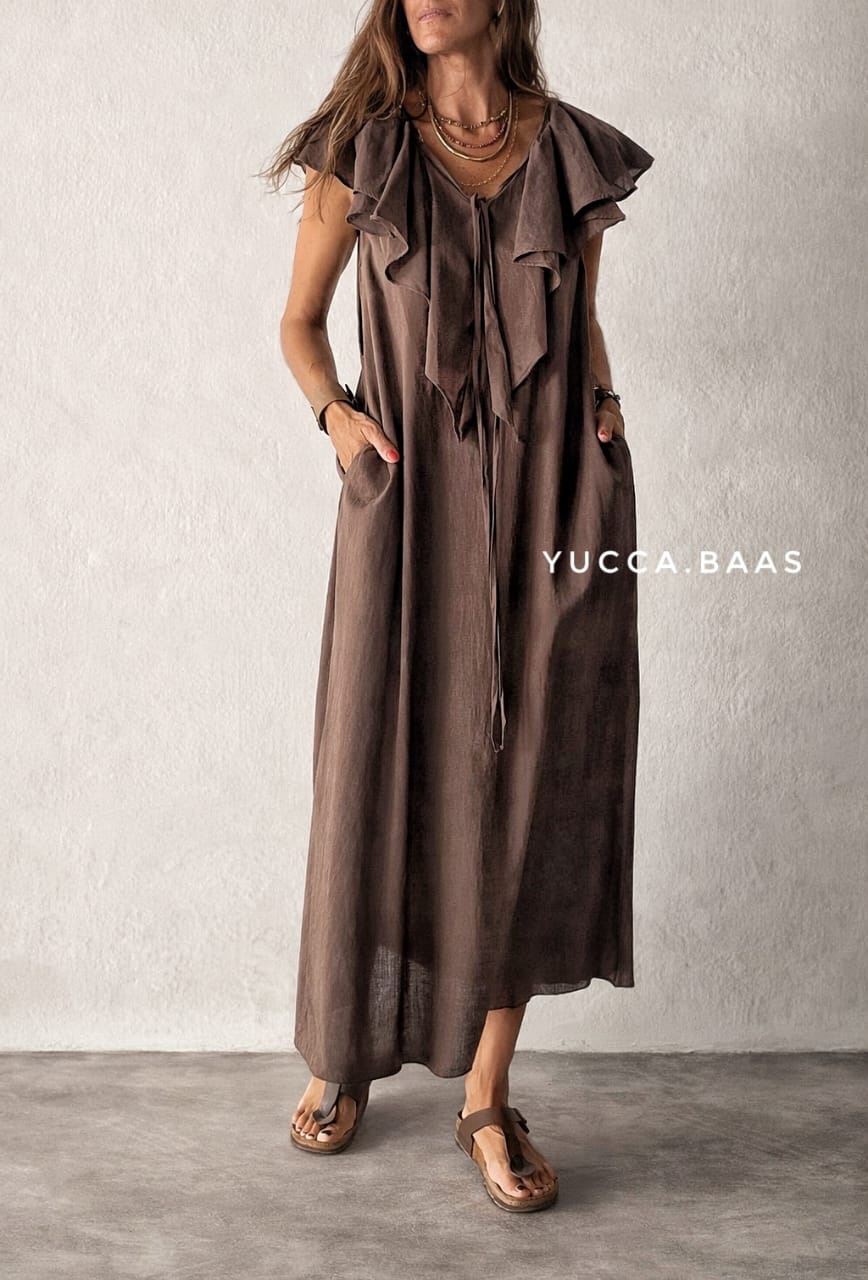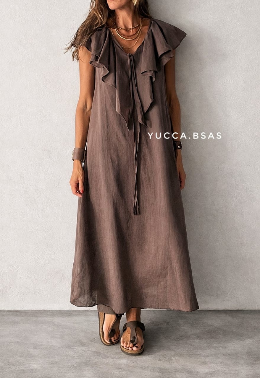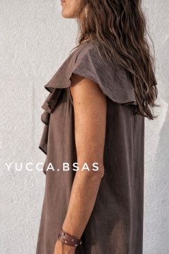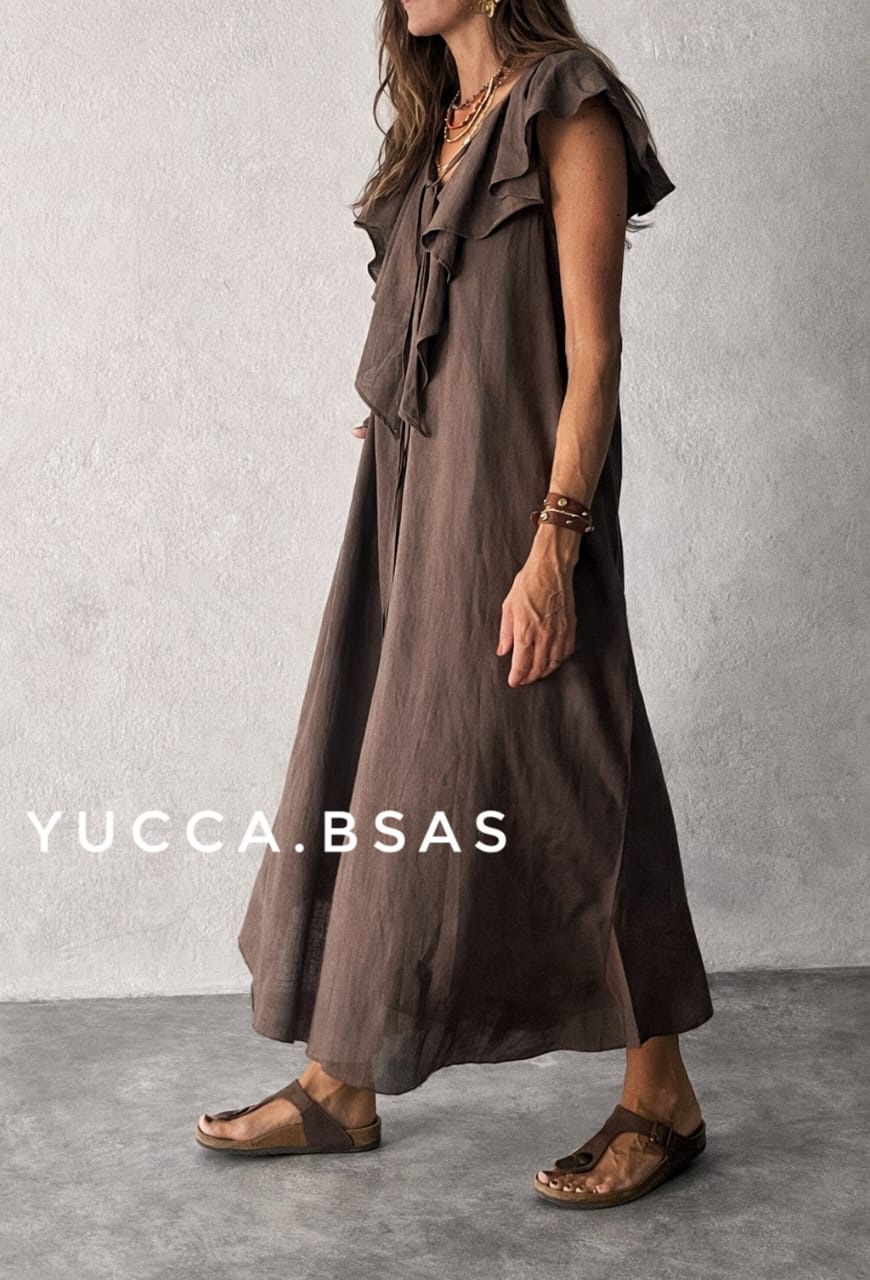 Vestido midi de algodón liviano con grandes volados en la pechera y lazo. Tiene bolsillos a los laterales.