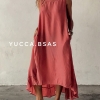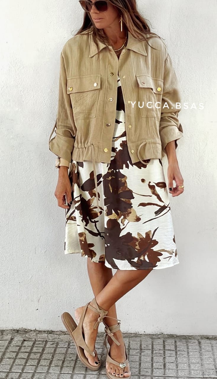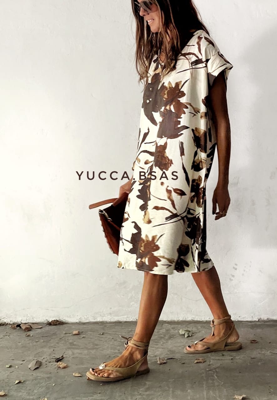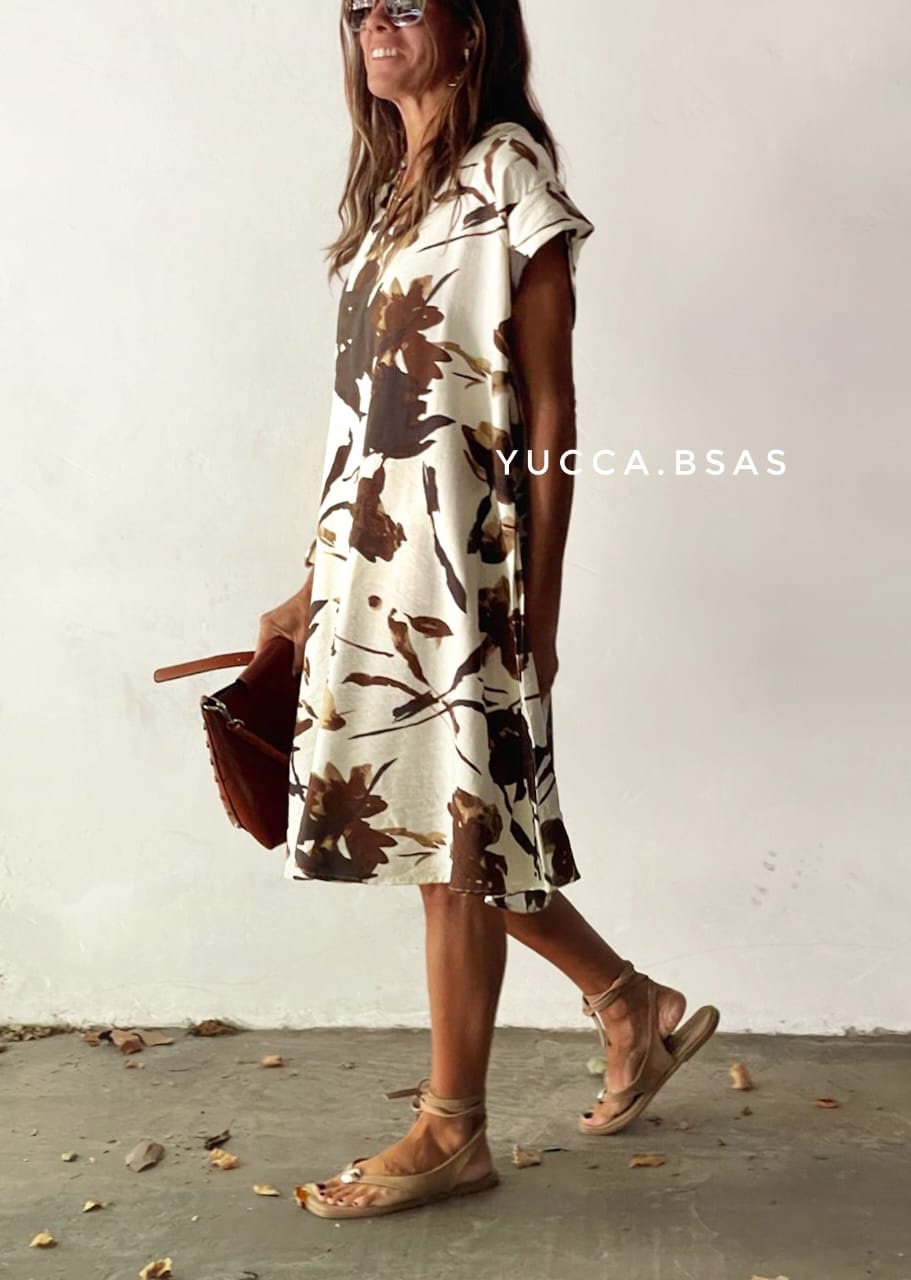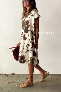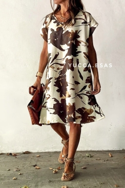 Vestido tipo lino con algodón estampado de cuello redondo, mangas japonesas y corte evasé.